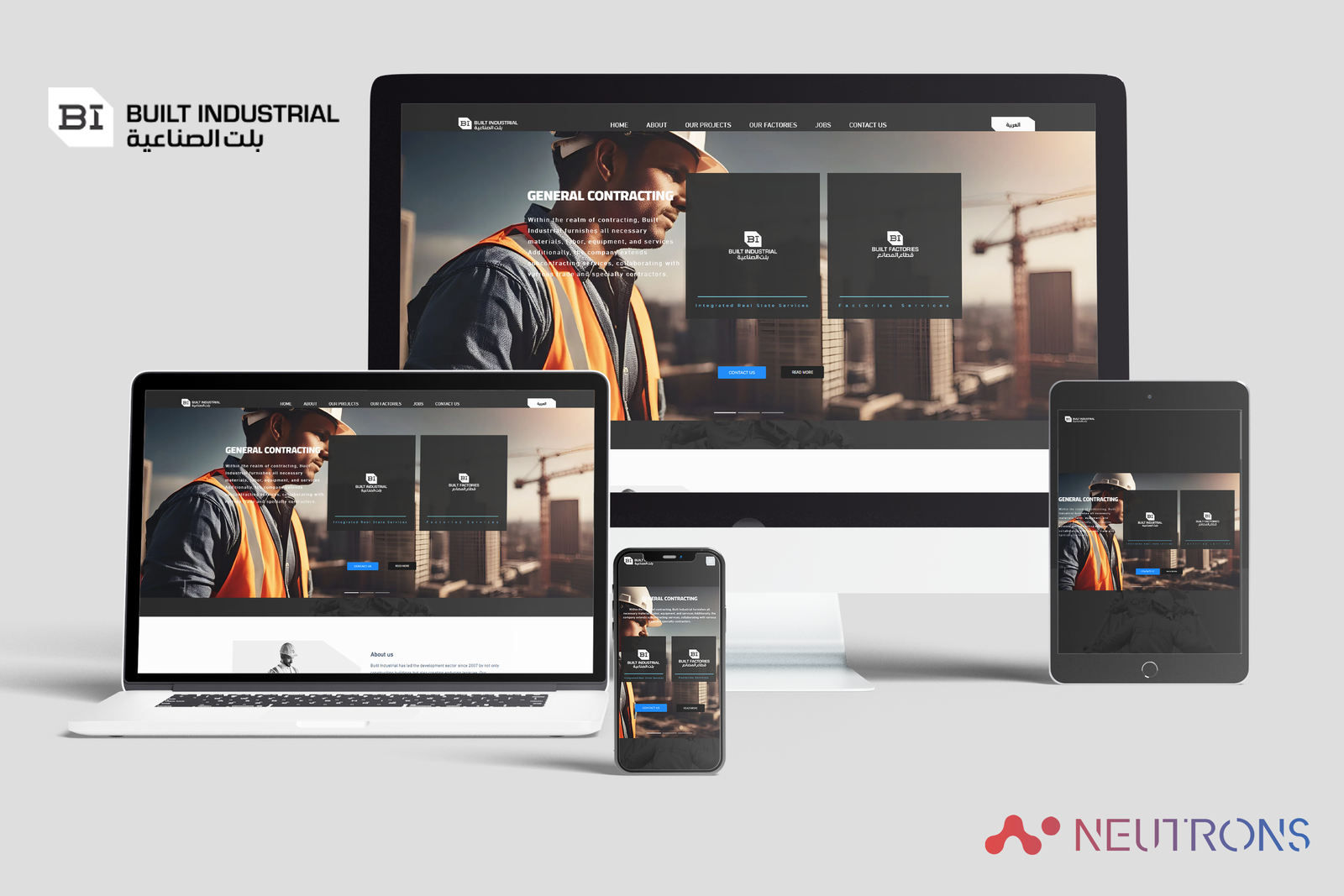 - Services overview, quick tiles for General Contracting, Integrated Real Estate Services, Built Factories / Industrial Services, Design & Build, and Turnkey Solutions.